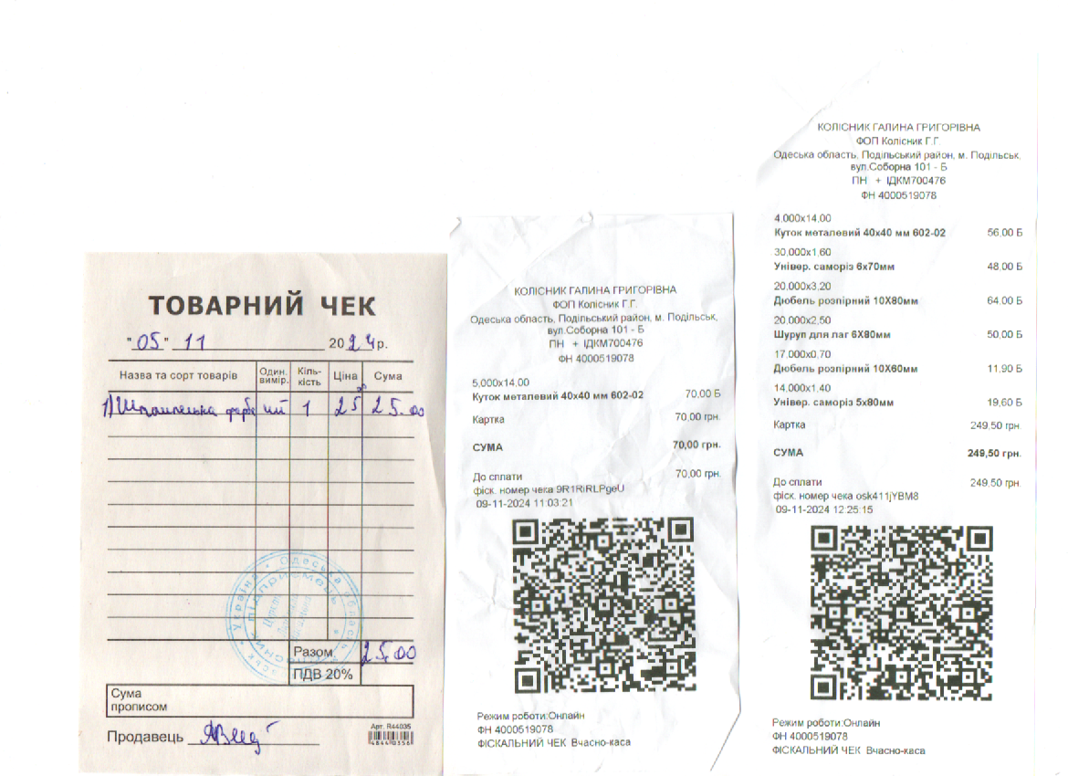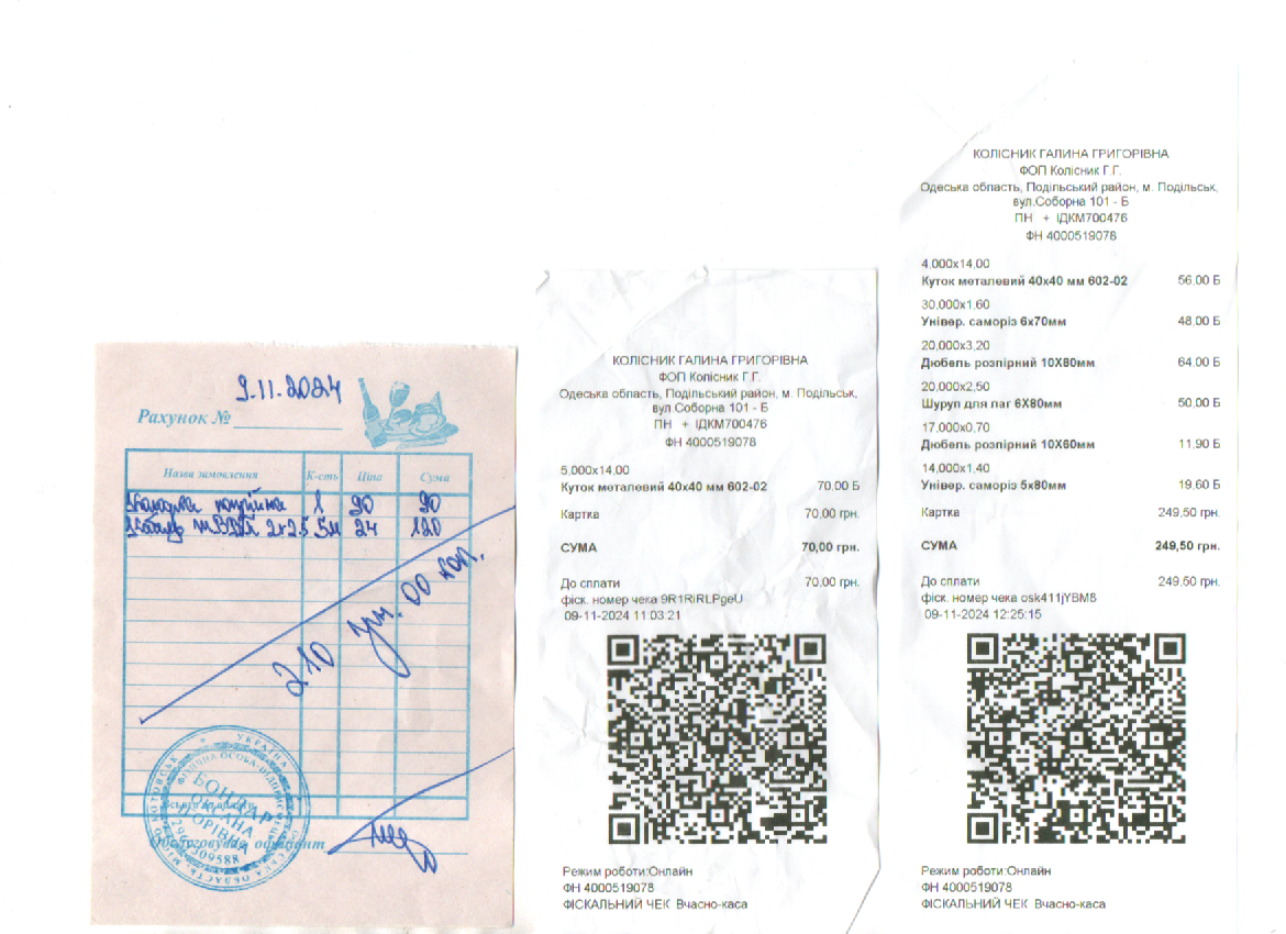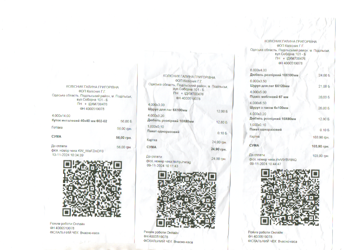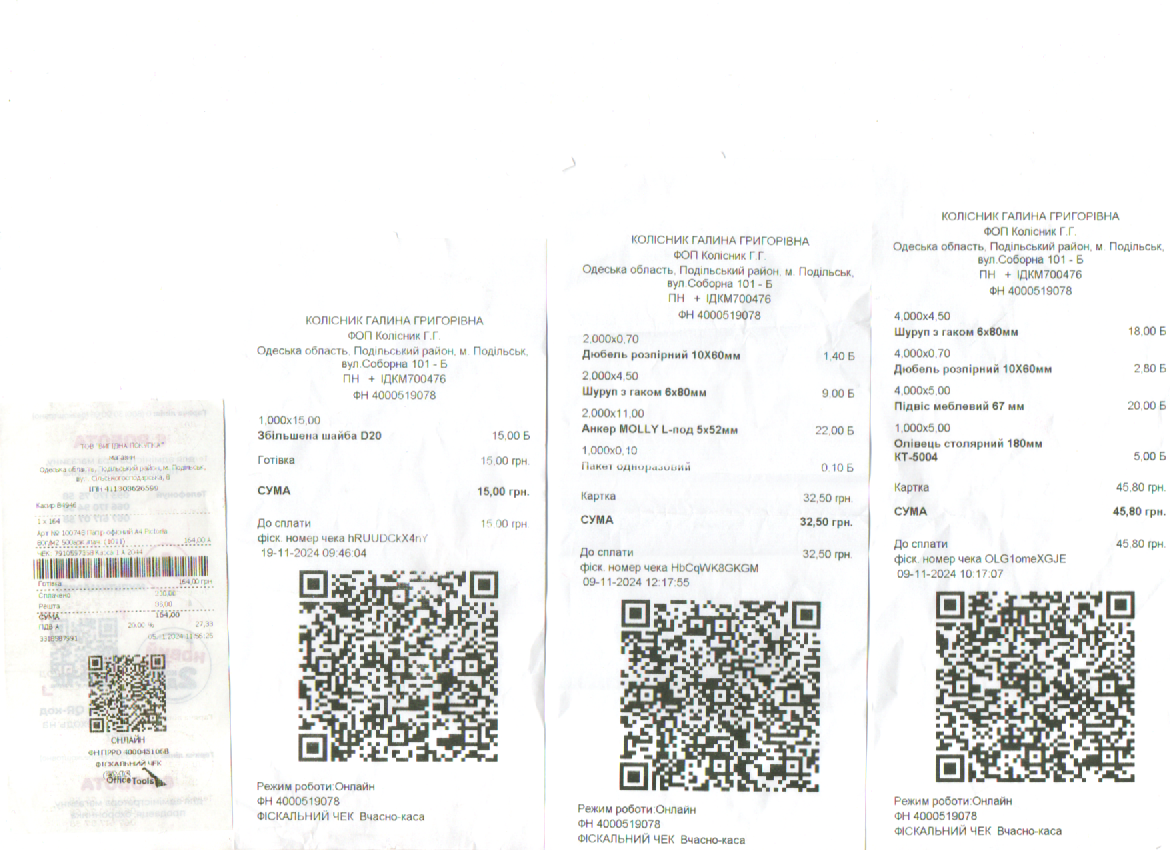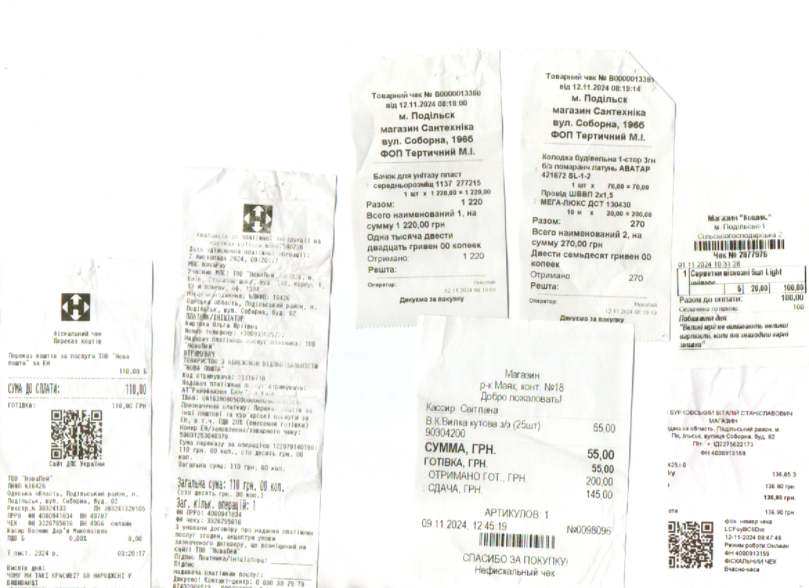 03.12.2024 Звіт про використання благодійних внесків за листопад 2024 року Залишок197.00 грн. Здано7700.00 грн.Витрачено 6267.00грн.Залишок 1630.00 грн. ВИТРАТИ: Господарські товари866.00 грн.Канцтовари 476.00 грн.Установка мультимедійних дошок 1585.00 грн.Бачок для унітазу (чоловічий туалет)1200.00 грн. Конкурс 2140.00 грн.